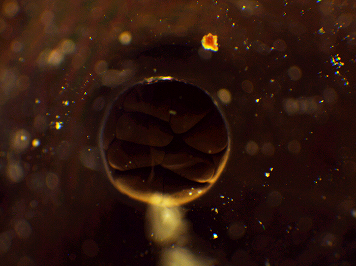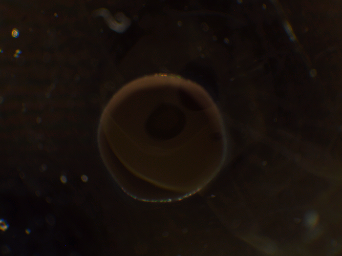正午ごろに顕微鏡でみると、すでに卵割が始まり、卵細胞が二つに分裂して2細胞期に入っていました。