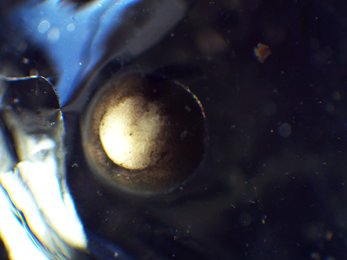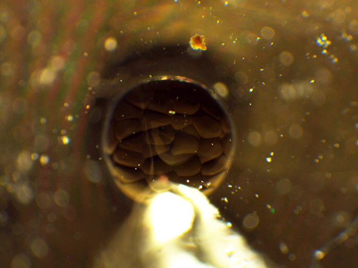 上にあるのが口です。右横腹に見えるのが鰓孔(さいこう)です。