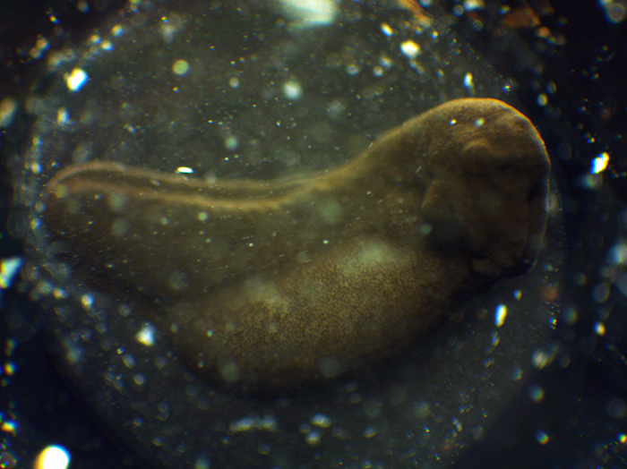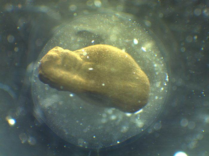オタマジャクシの体になる部分(胚)が発達して、卵黄が見えにくくなってきました。