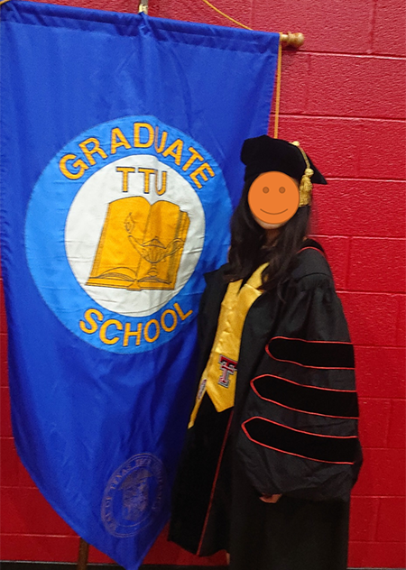 彼女は研究実績が高く評価され、大学院生代表(banner bearer)として卒業したそうです。